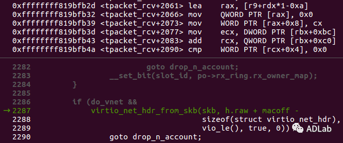 ÐÐ2287£¬£¬£¬£¬£¬Å²ÓÃvirtio_net_hdr_from_skb()º¯Êý´Ósk_buffÖп½±´Êý¾Ý£¬£¬£¬£¬£¬¸Ãº¯ÊýµÚ¶þ¸ö²ÎÊýΪh.raw + macoff ¨C sizeof(struct virtio_net_hdr)£¬£¬£¬£¬£¬h.rawΪtpacket_rcv_uhdrÀàÐ͵ÄÖ¸Õ룬£¬£¬£¬£¬Ö¸Ïò»·Ðλº³åÇøµÄframe£¬£¬£¬£¬£¬ÓÉÓÚmacoffÊǿɿص쬣¬£¬£¬£¬¿ÉÒÔÈÃmaoffСÓÚsizeof(struct virtio_net_hdr)£¬£¬£¬£¬£¬µ¼ÖÂÏòǰԽ½çд£¬£¬£¬£¬£¬×î¶à¿ÉдÈësizeof(struct virtio_net_hdr)¸ö×Ö½Ú¡£¡£¡£¡£¡£¡£Æ¾Ö¤ÌṩµÄPoC£¬£¬£¬£¬£¬µ÷ÊÔ´úÂëÈçÏÂͼËùʾ£º