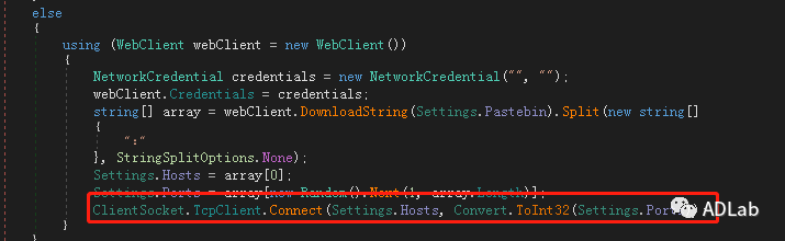 ÆäÊ×ÏÈ»á¶ÔÉèÖÃÐÅÏ¢ÖС°Pastebin¡±µÄÖµ×öÅжϣ¬£¬£¬£¬ÈôÊDz»ÎªNULL£¬£¬£¬£¬ÔòʹÓÃwebClient.DownloadStringÒªÁì»ñȡЧÀͶ˵ÄÉÏÏßÓòÃû/IPºÍ¶Ë¿ÚºÅ£¨´Ó¡°Pastebin¡±ÉÏÌáÈ¡£¡£¡£¡£¡£¡£©¡£¡£¡£¡£¡£¡£²¿·Ö´úÂëÈçͼ4-38Ëùʾ¡£¡£¡£¡£¡£¡£